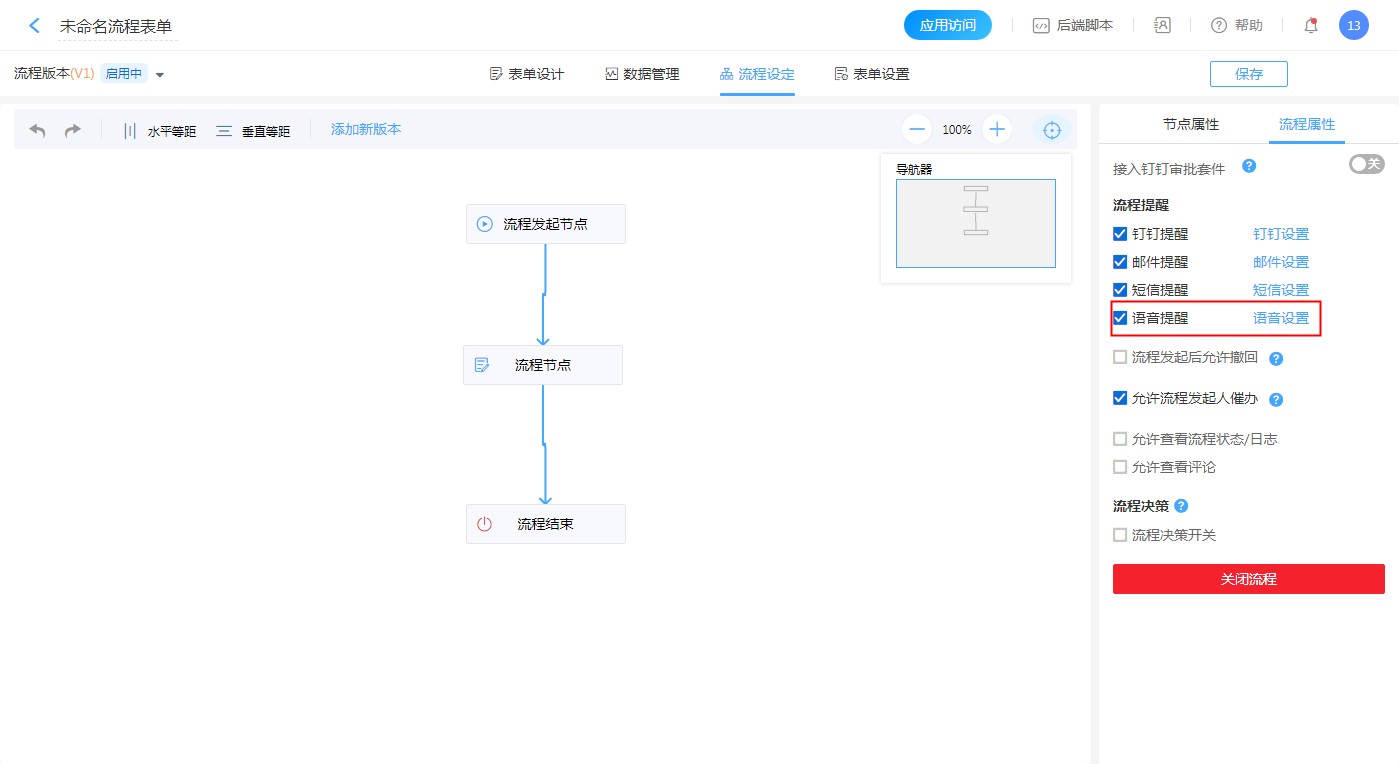【流程设计】-【流程设定】-【流程属性】-【流程提醒】-【语音提醒,语音设置】