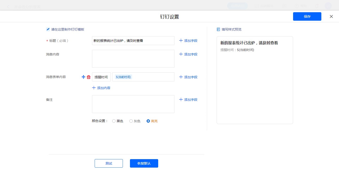 • 标题:必填,支持自定义文字,以及添加[当前时间]字段。
