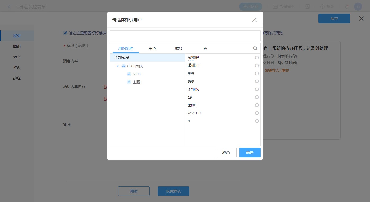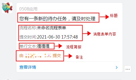• 流程表单的提交、回退、转交、催办、抄送五种场景类型的消息模板,支持分别设计。