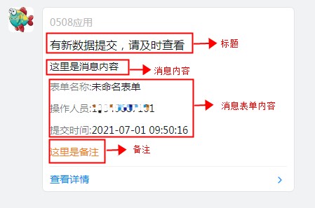 注意:收到的测试消息中,普通字段会以字段名称代替。