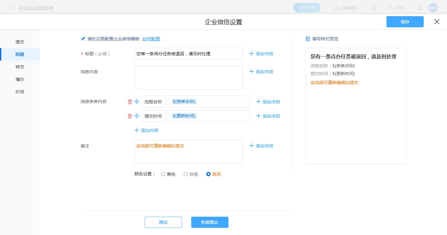 企业微信用户登录,在设计流程表单、普通表单、数据助手消息设置时选择企业微信提醒时,可设置企业微信消息模板。