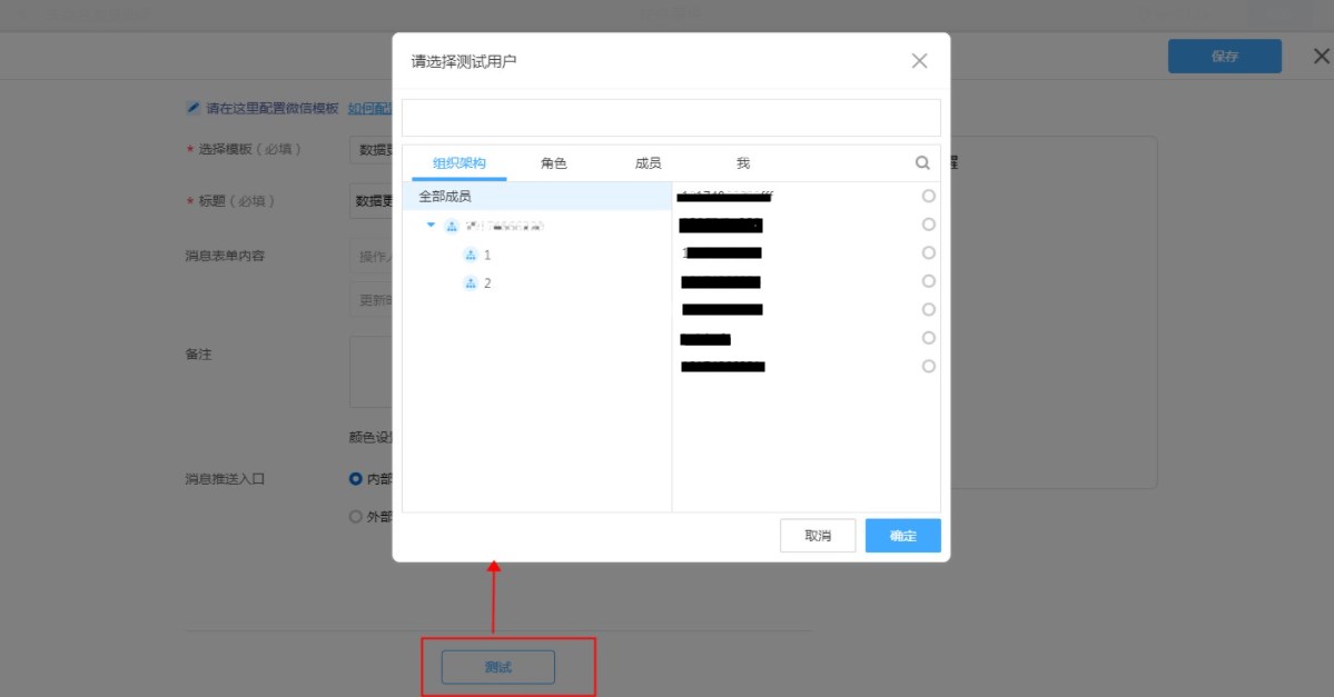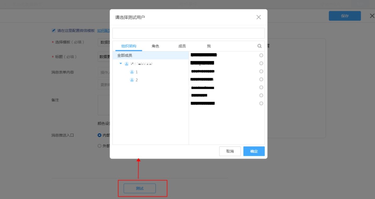 点击测试,选择收件人,确认即可将当前消息模板内容发送给此收件人。