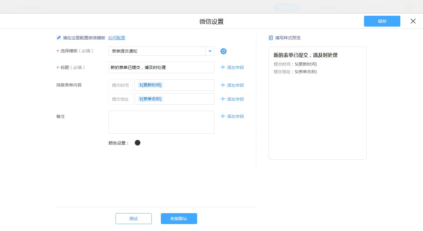 流程表单、普通表单、数据助手消息设置时选择微信提醒时,可设置微信消息模板。