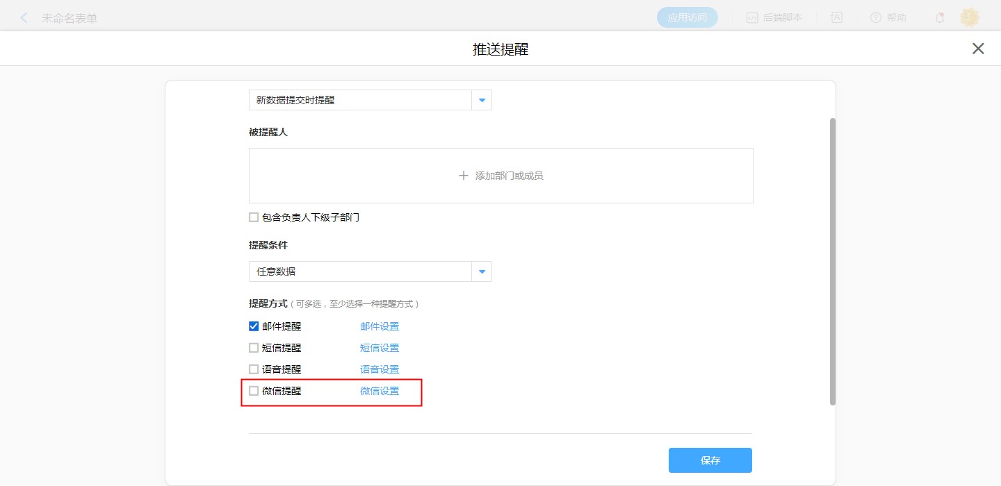 【普通表单设计】-【表单设置】-【消息推送】-【新建消息推送】-【微信提醒,微信设置】