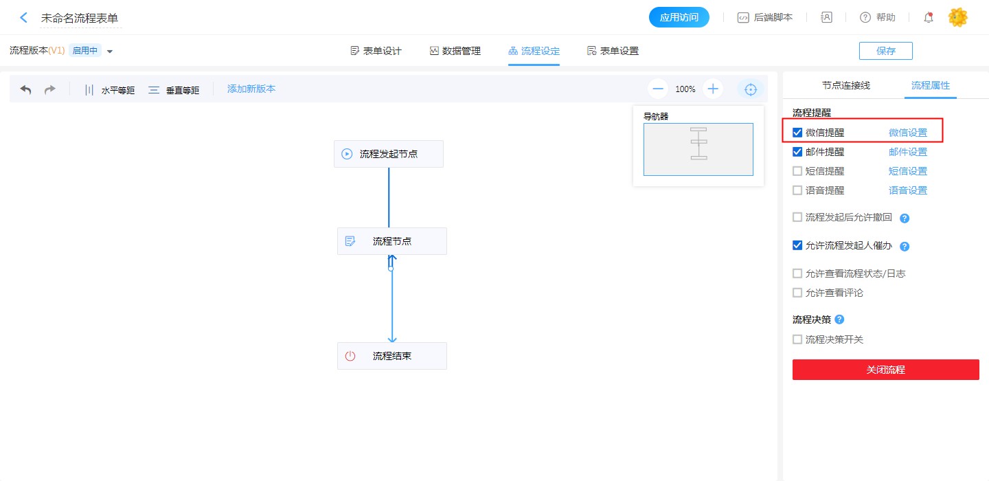 【流程设计】-【流程设定】-【流程属性】-【流程提醒】-【微信提醒,微信设置】