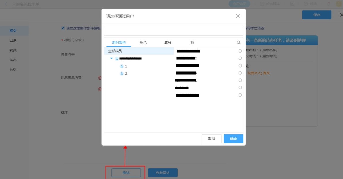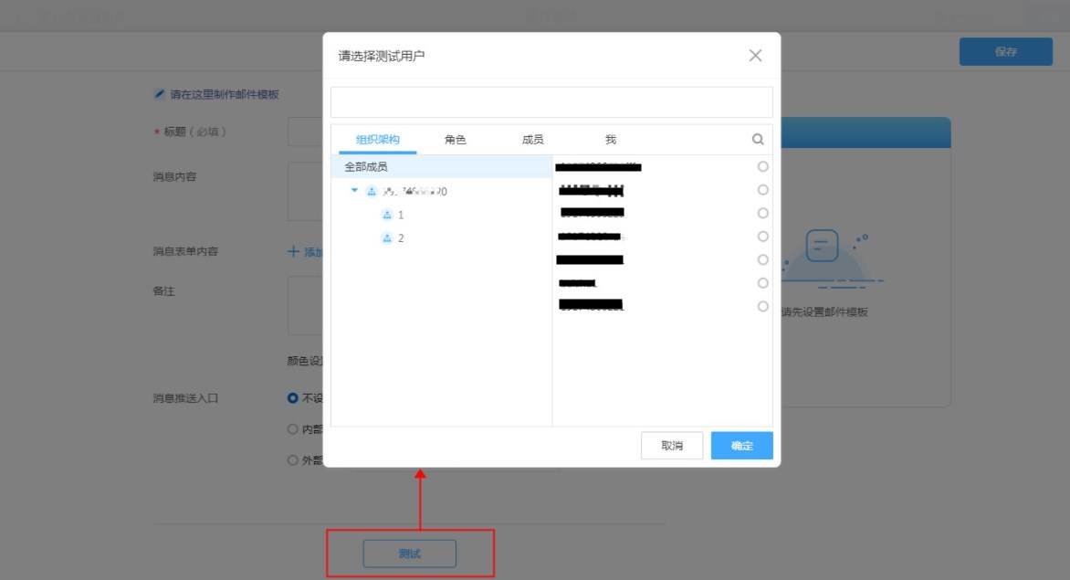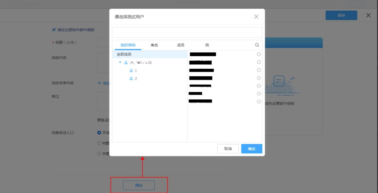点击测试,选择收件人,确认即可将当前消息模板内容发送给此收件人。