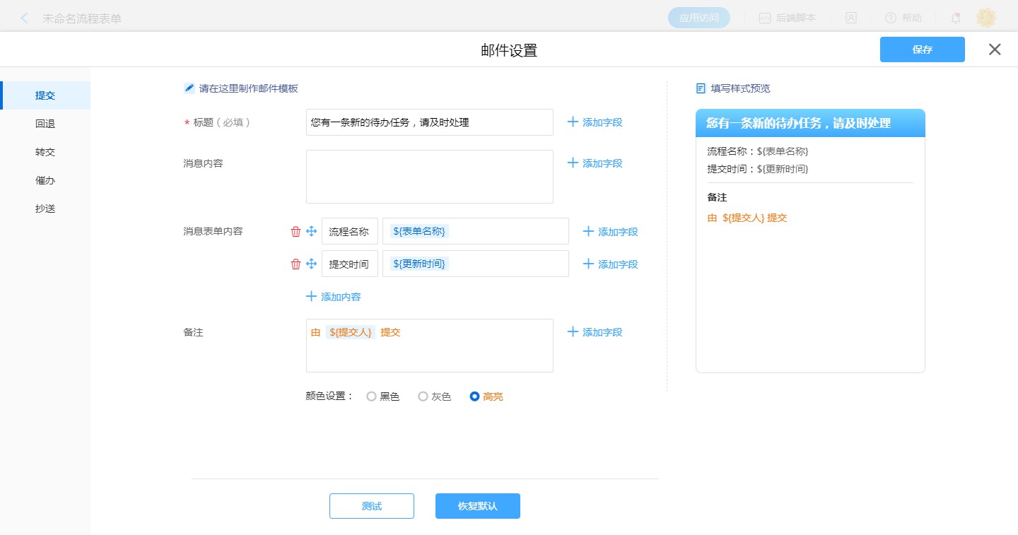 • 流程表单设置邮件信消息模板