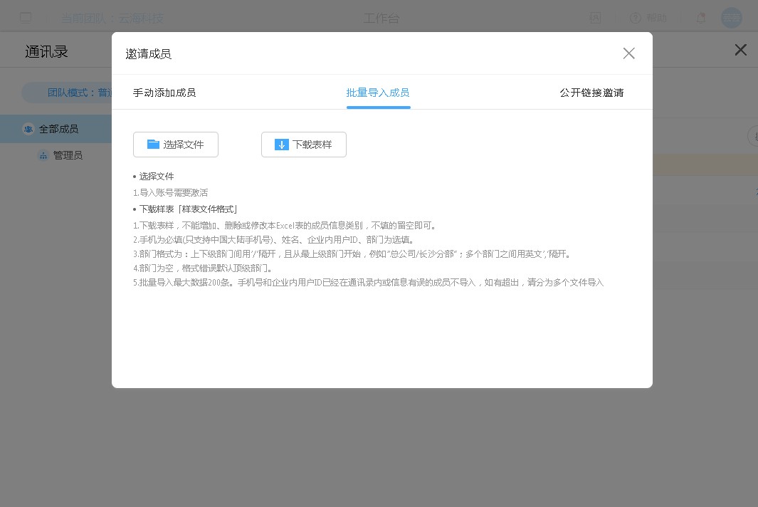 2. 在前台使用页面登录后,进入通讯录->邀请成员->批量导入成员;