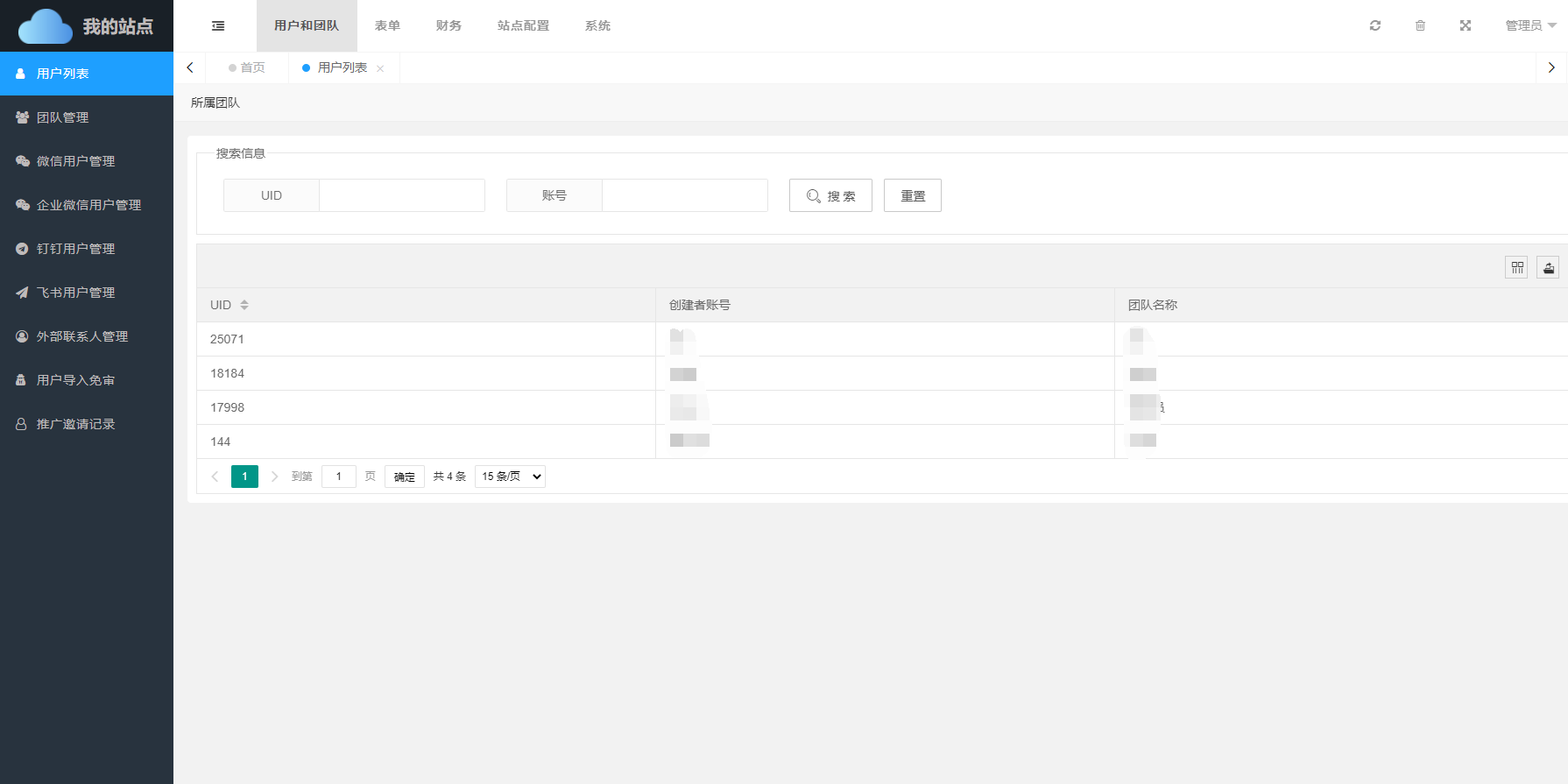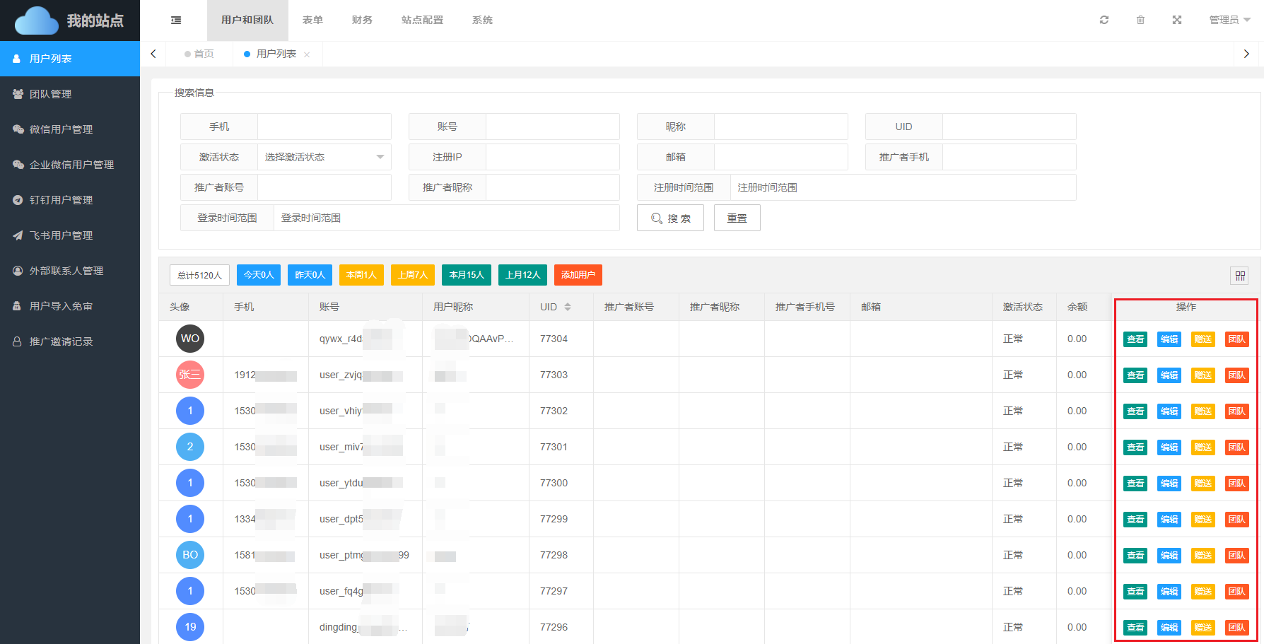 用户列表中,会列出所有注册用户,包括普通账号、微信、企业微信、钉钉账号,管理员可以在用户列表对每一个用户做出相应的管理操作。