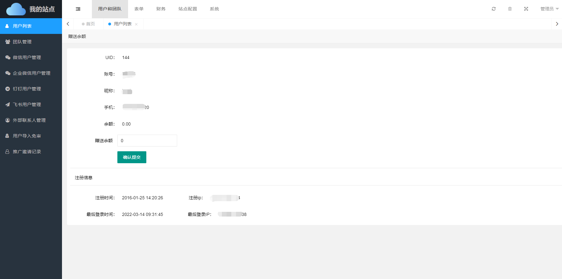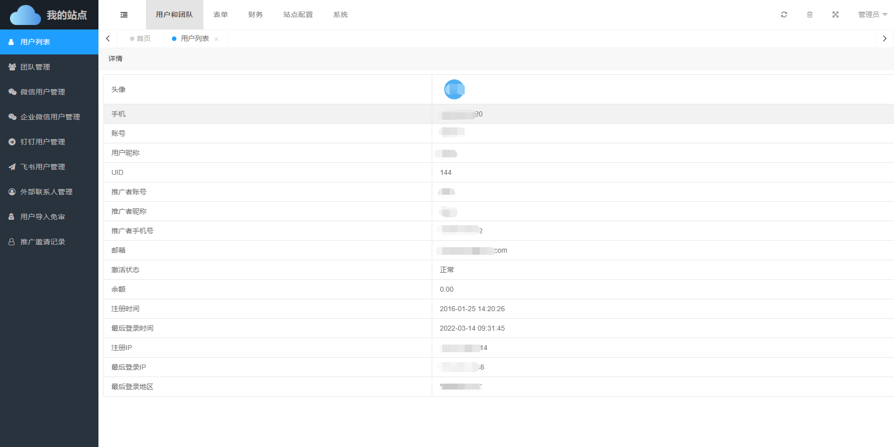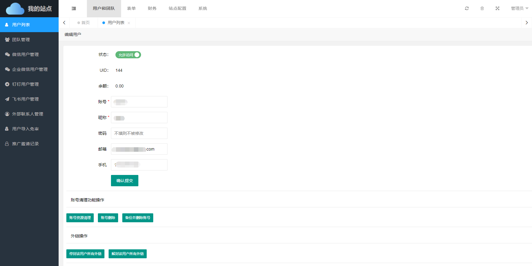 可通过编辑用户信息,修改用户的访问状态[允许访问、禁止访问]、昵称、密码、邮箱、手机号码;外链的封停与解封;以及查看用户的注册信息[注册时间、注册IP等]