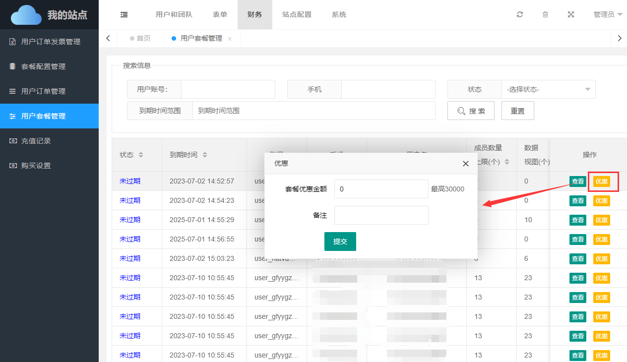 用户购买的套餐,都会在用户套餐列表中进行展示,可以进行①查看,还可直接对用户的订单进行②优惠处理。