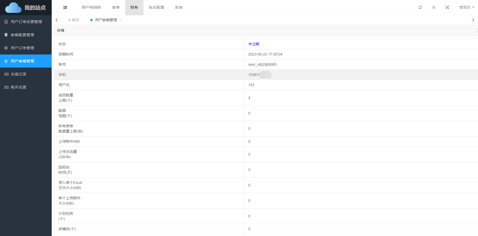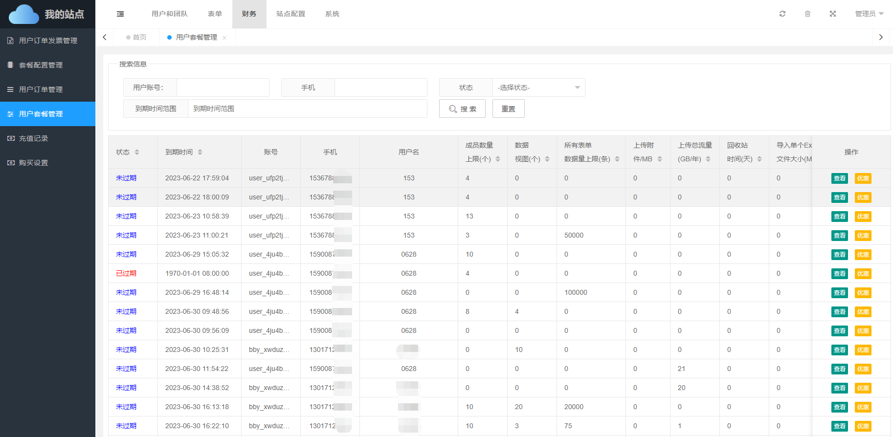 用户套餐中会列出所有已购买的套餐状态,包括购买的时间、套餐的状态、套餐的具体配置信息以及购买用户的信息等。