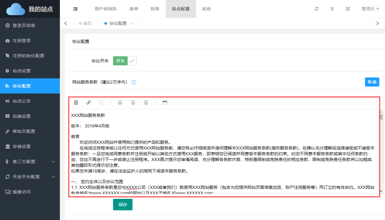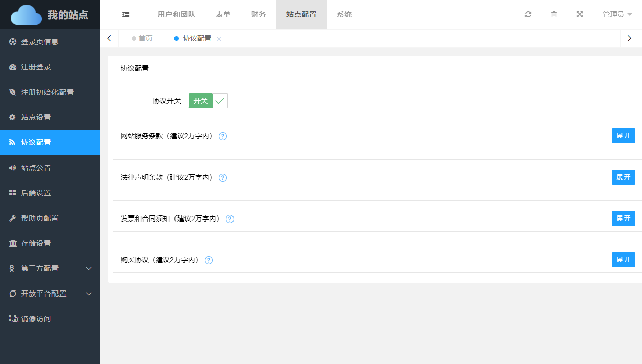 协议配置,主要是对网站条款、声明以及合同进行设置,设置好后,在对应的位置会正确显示其协议内容。
