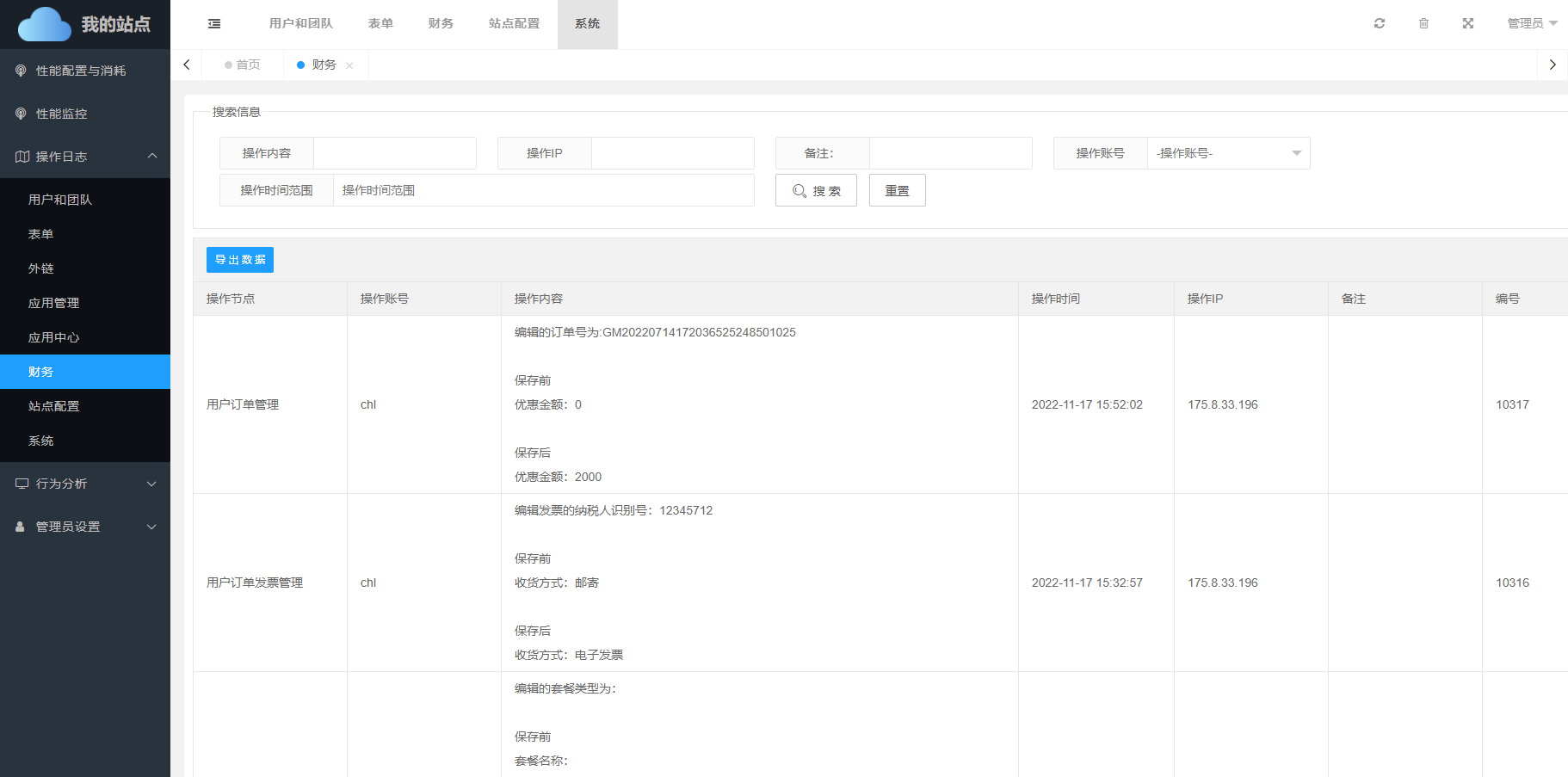 管理员在对管理后台中用户订单管理、用户套餐管理、套餐配置管理等于财务有关操作,会记录在财务日志中