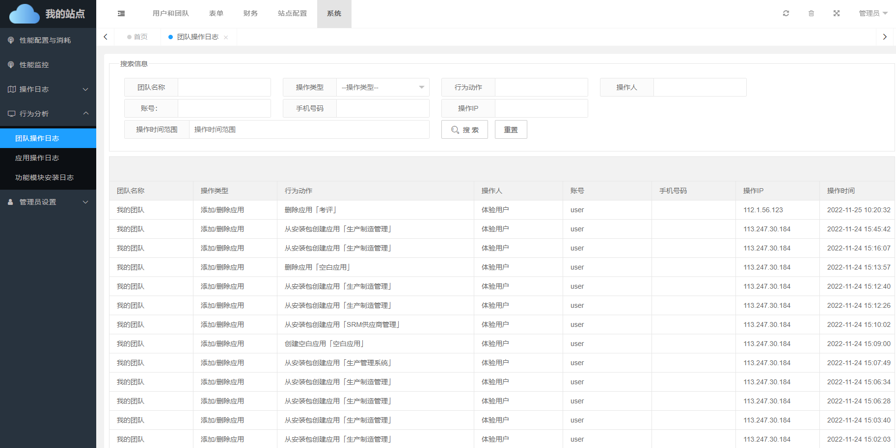 管理员在用户和团队分类下所做的操作,会在团队操作日志中进行展示。
