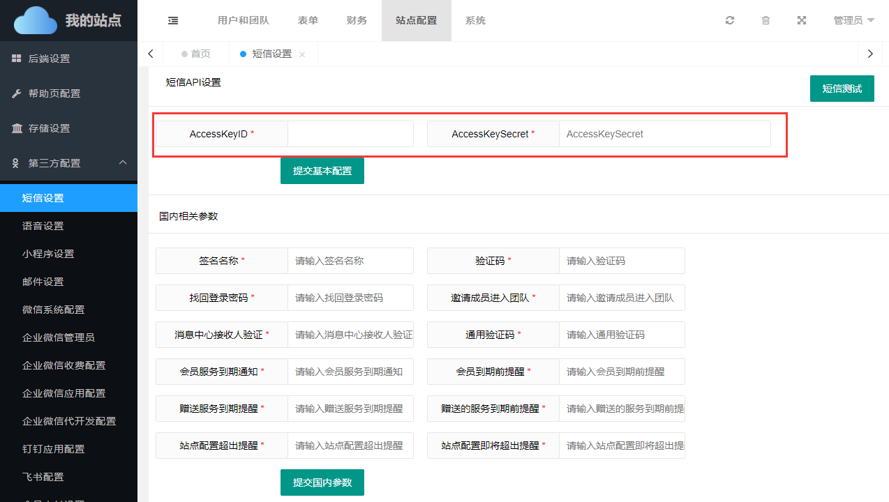 获取之后,在站点->短信设置->短信API设置 内填写 AccessKey ID和AccessKey Secret