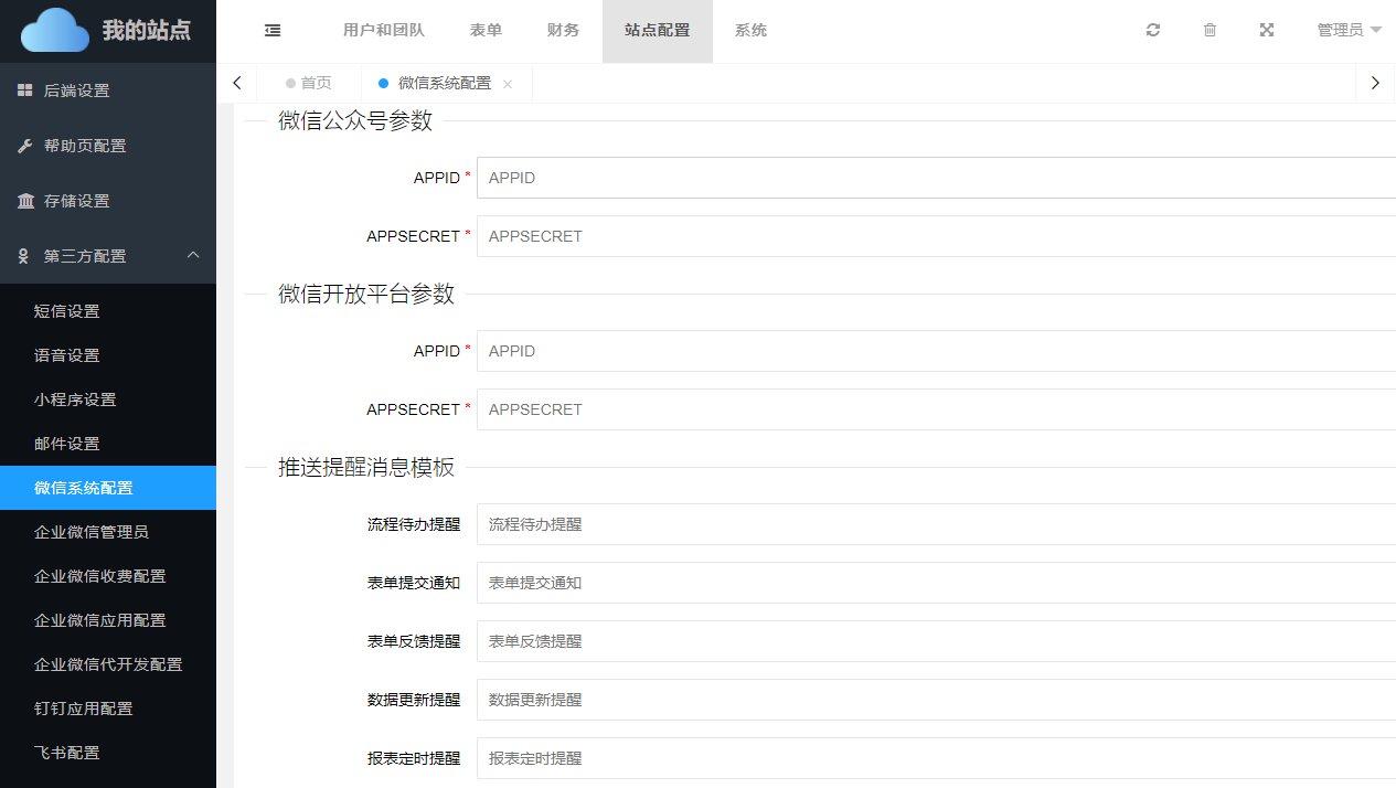 进入管理后台后,在站点配置->第三方配置->微信系统配置中 填写相应的参数信息。