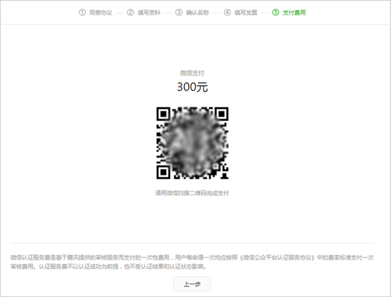 整个认证的流程除了刚才提到的同意协议外,包括填写企业认证资料、确认名称、选择发票、支付费用、等待审核。