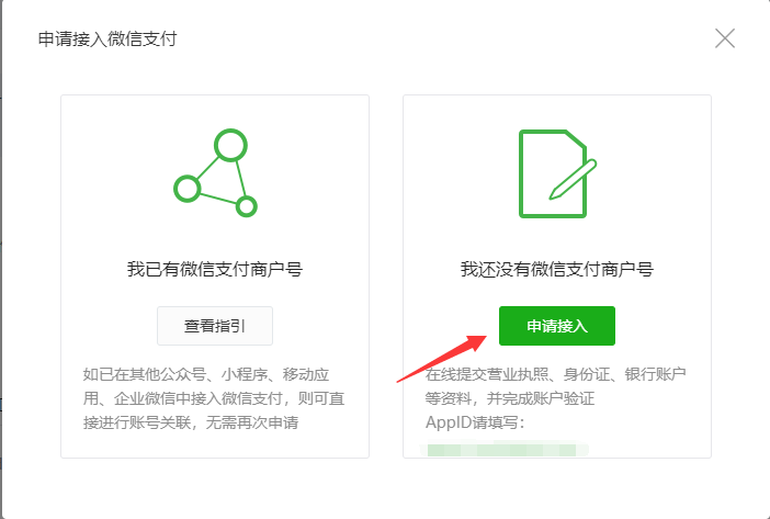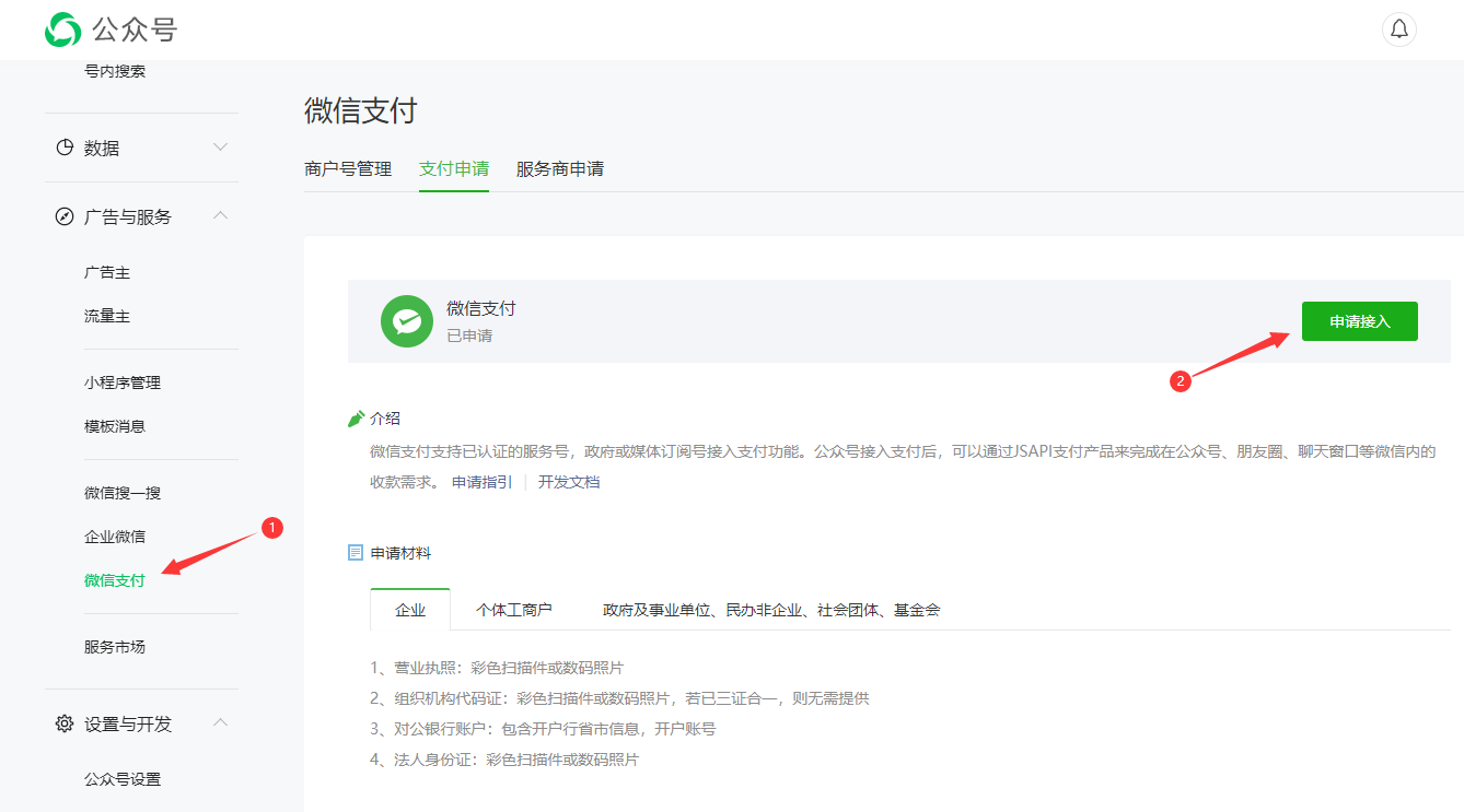 2.1、登录微信商户平台->产品中心->APPID授权管理->新增授权申请,输入公众号APPID进行授权绑定