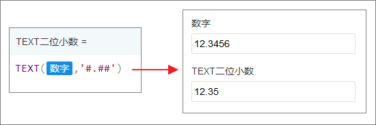 | TEXT(12.3567,"#.##") | 结果为 12.36 |