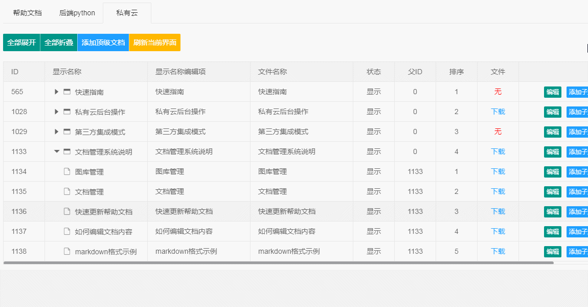 在文档列表管理页面中,找到需要替换的文档文件所在目录,点击编辑进入二级操作页面,重新上传markdown文档。