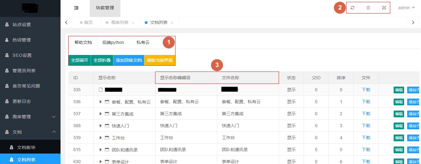 如图所示,在文档列表管理页面选择需要更新的板块,查看文档目录。