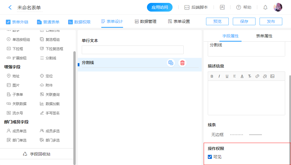 注意:流程表单字段的操作权限在“流程设置”-“节点属性”中定义,此处的设置无效。