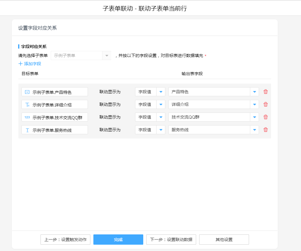 1. 添加执行动作子表单联动,操作模式选择“联动子表单当前行”,设置联动对应关系。