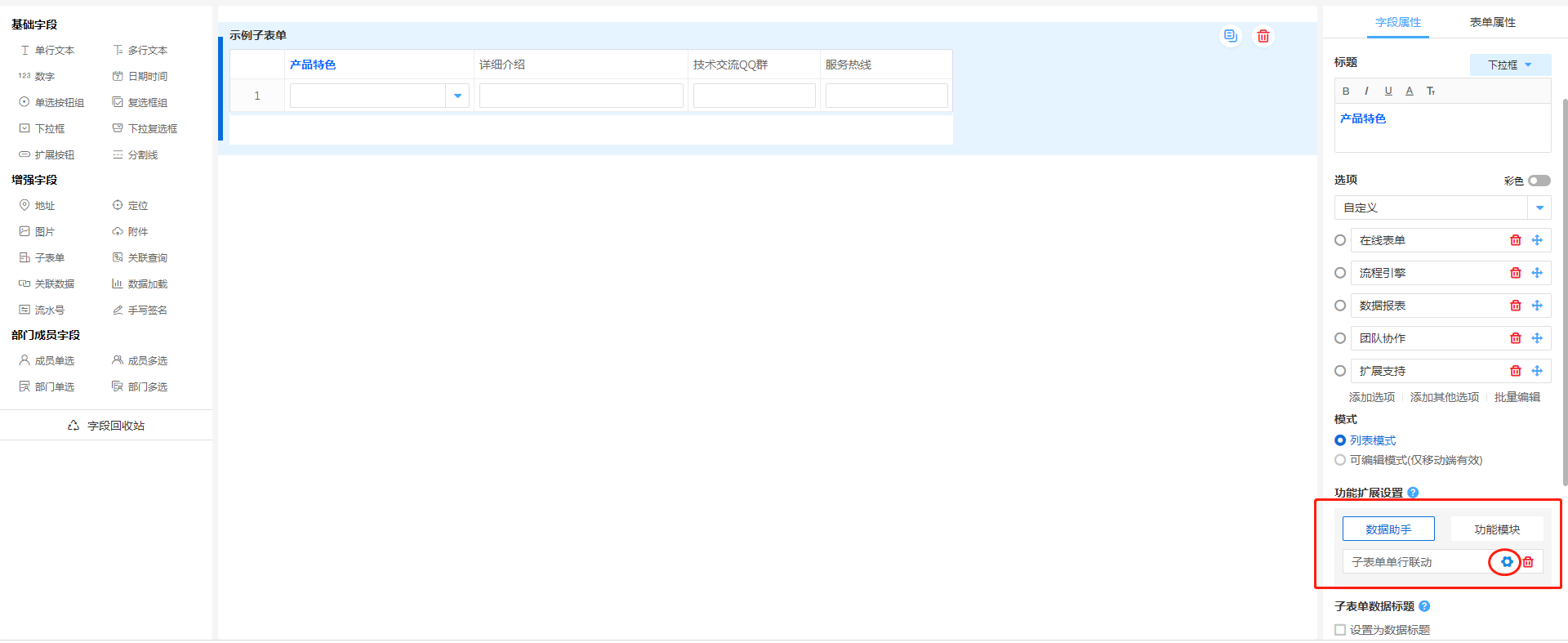 通过对控件进行数据助手配置,实现子表单内单行数据联动