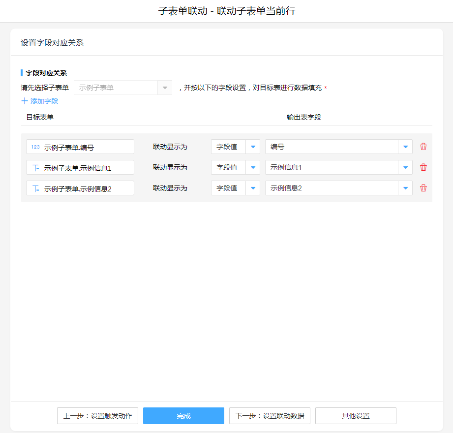 通过对控件进行数据助手配置,实现联动多个子表单进行数据调取。