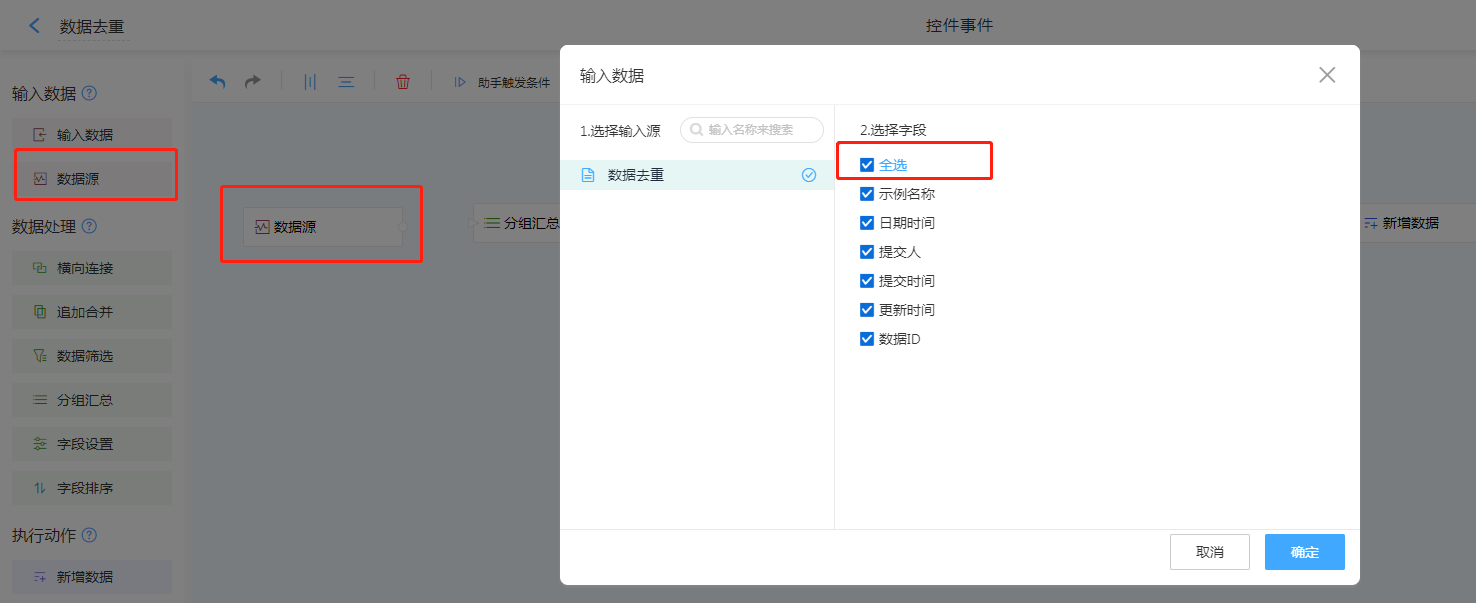 1. 输入数据选择数据源,选择需要去重的表单,全选字段。