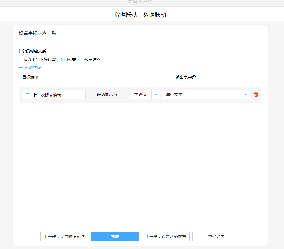 1. 添加执行动作数据联动,进行字段对应关系设置,将筛选出来的数据联动显示到当前表单。