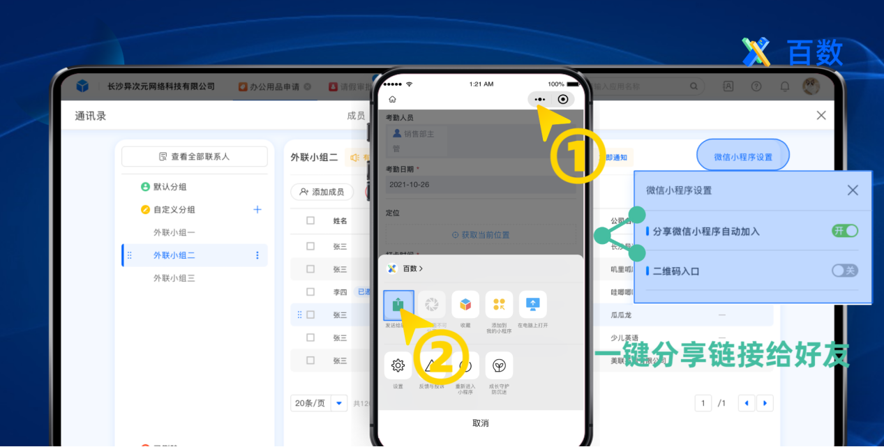 百数在电商领域具备丰富的项目经验,基于供应链上下游协同的应用需求,建立以企业为核心的上下游垂直一体化产业链布局,解决了多家企业供应链协同的难题。一般平台的上下游互联,企业与企业之间的连接过程需要跳转7-8个步骤,操作较为复杂。如果需要链接平台外的企业,还需要借助excel导入外部通讯录进行联系人设置,达不到便捷互联协作的效果,而利用百数小程序只需要1-3个步骤就可以轻松实现一键互联。
