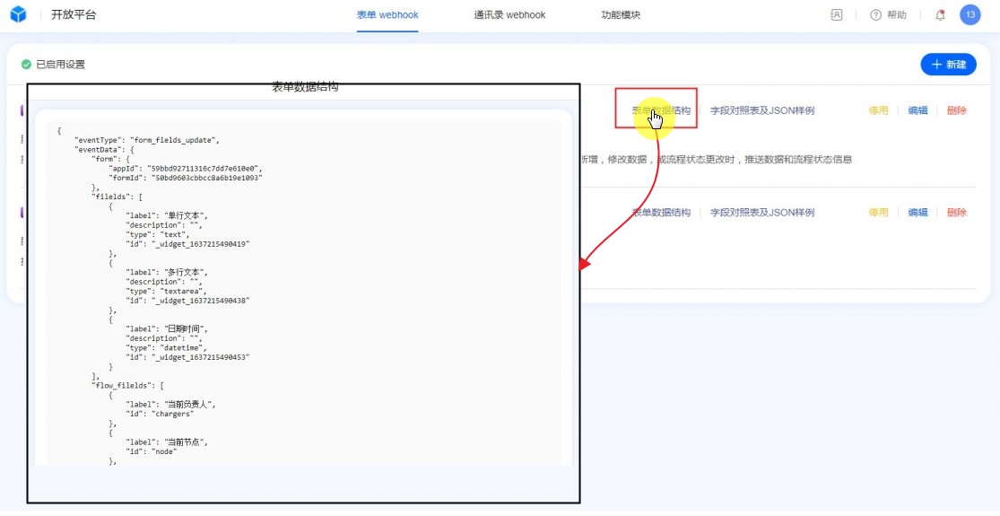 表单数据结构&字段对照表及JSON样例中可以查询表单数据及其字段的具体类型格式信息,用户在开发时可以在此处参照相关信息。