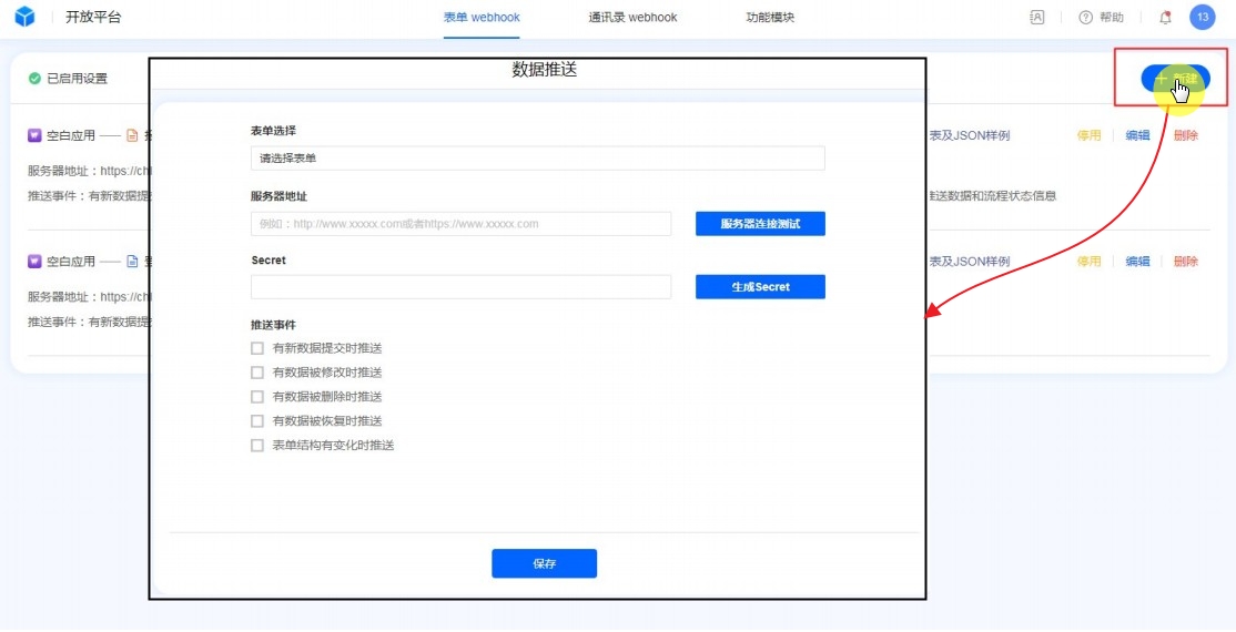 需要推送某个表单的数据,就对这个表单新建一个数据推送。