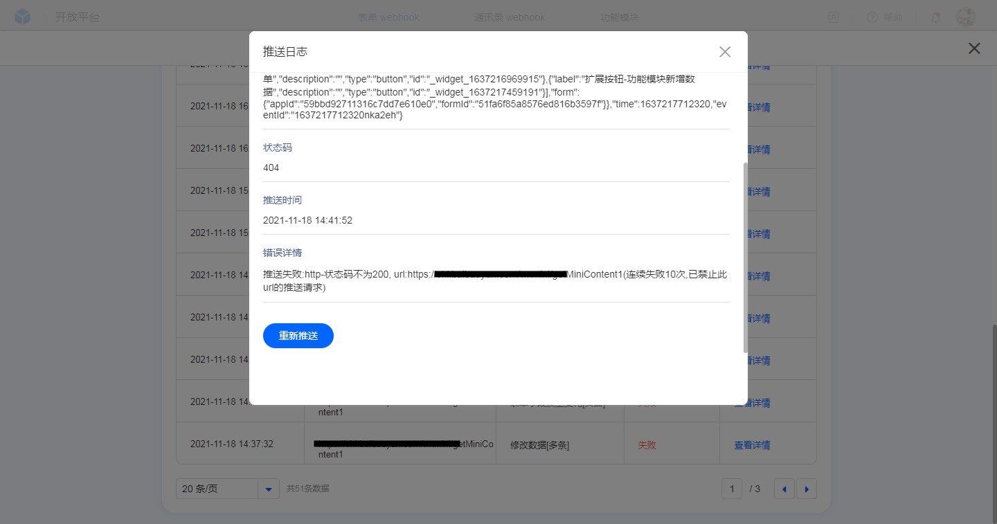 - 推送详情中可以查看到推送内容、状态码、推送时间、错误详情等信息,如果事件推送错误了还以在此处查看到具体信息。