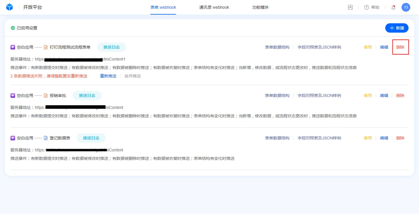 删除已存在的表单数据推送设置,删除后不再进行数据推送。