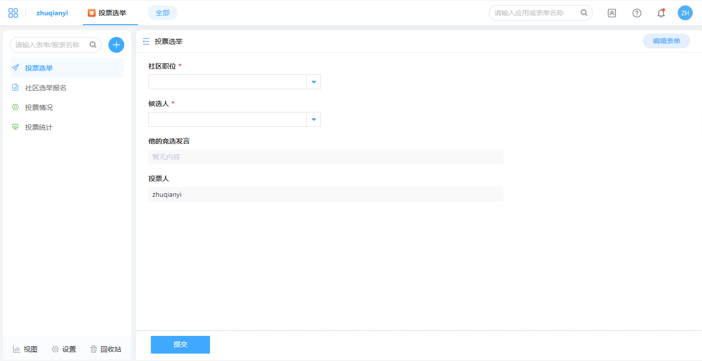 为了让社区居民了解社区工作、参与社区重大安排的讨论,选举居民干部成为越来越多社区每年定期展开的活动项目。本系统按照投票选举流程制定了在线表单,投票详情实时可查,不需要担心传统的“唱票”形式带来的计算错误,可视化数字大屏让所有参会人员即时了解报名人数、投票结果、职位占比等情况,既公开透明,又提质增效。