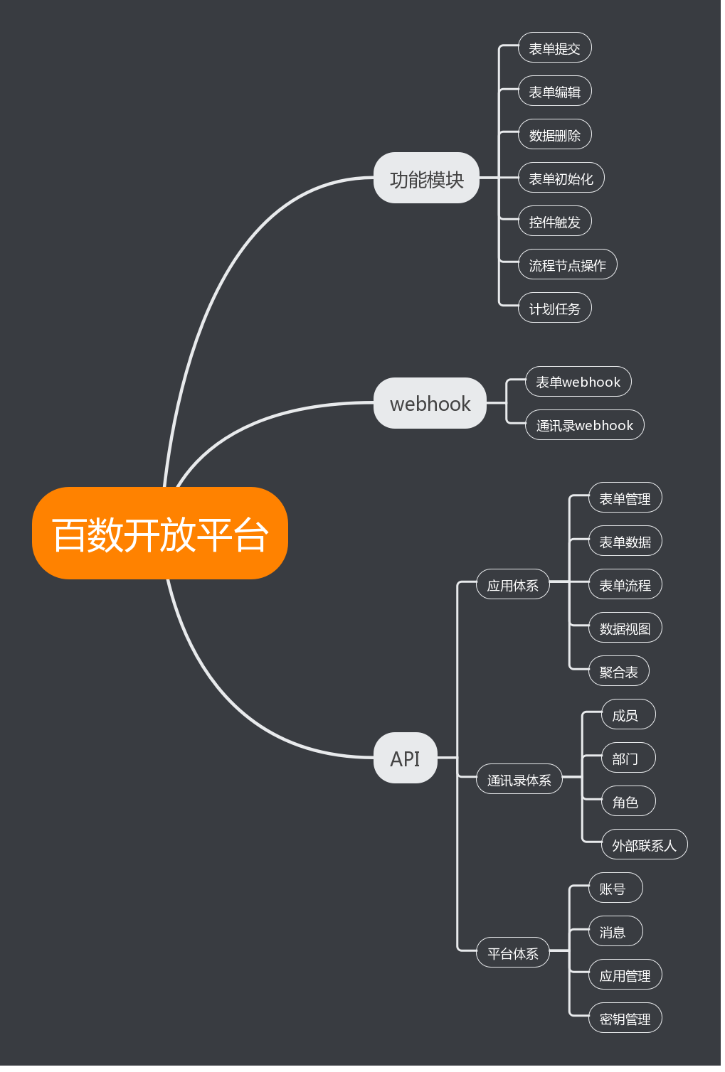 百数开放平台是基于产品内的 API接口,为用户提供开发能力,让用户可以通过自主开发或者使用官方、第三方服务商等开发的功能来实现企业系统之间互通的需求。除开webAPI接口,百数开放平台还包括:表单 webhook、通讯录 wehook、功能插件、密钥管理等功能。