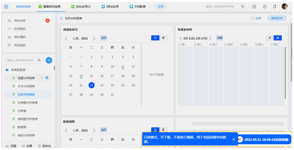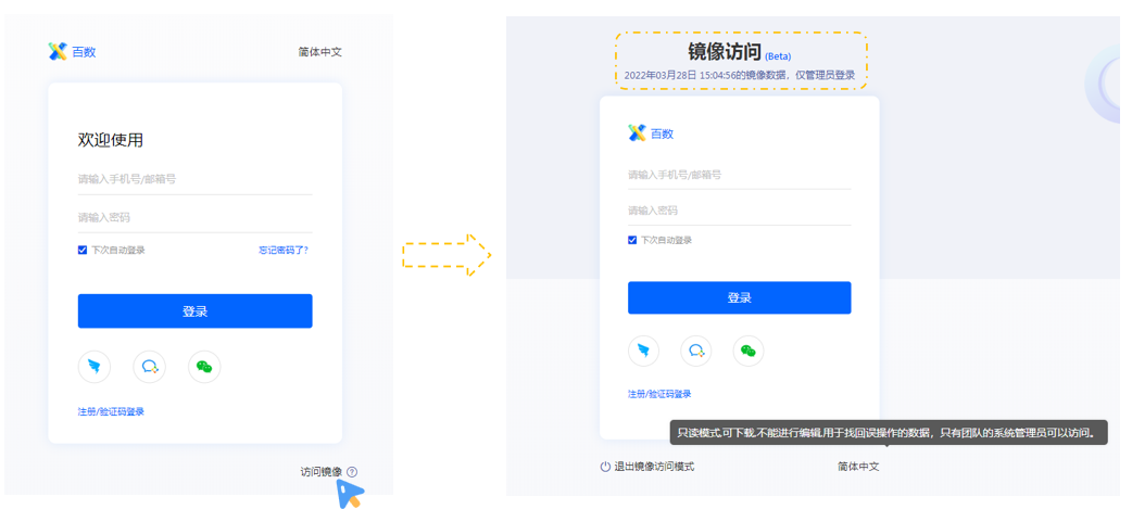 为增强百数用户数据安全系数,百数推出私有云镜像访问模式,当发生误删时,可选择该操作相近的时间点,查看该时段内的系统数据情况,减少因误删数据带来的负面影响。