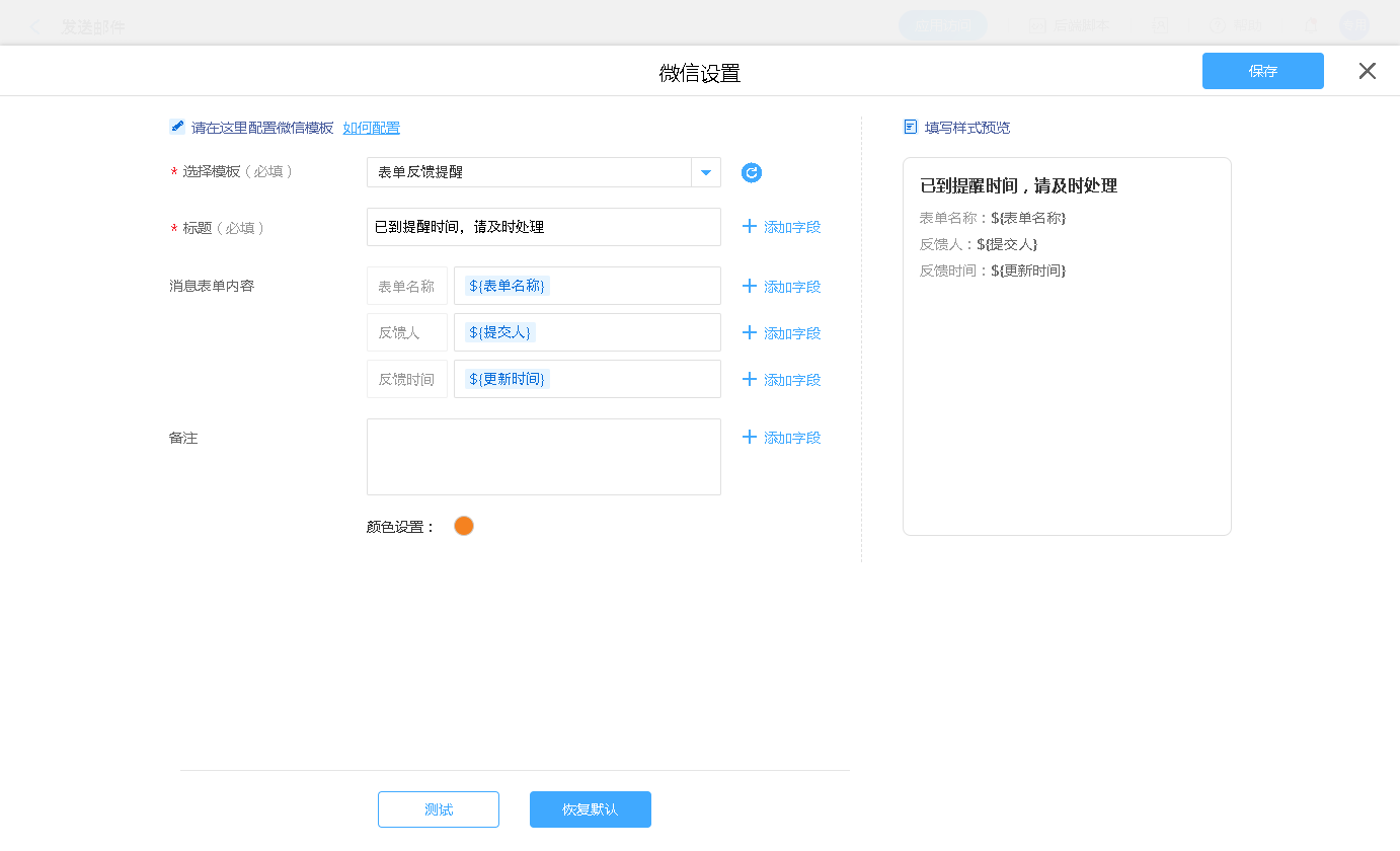 “微信提醒”可将需要的内容直接通过微信推送给对应的接收人。