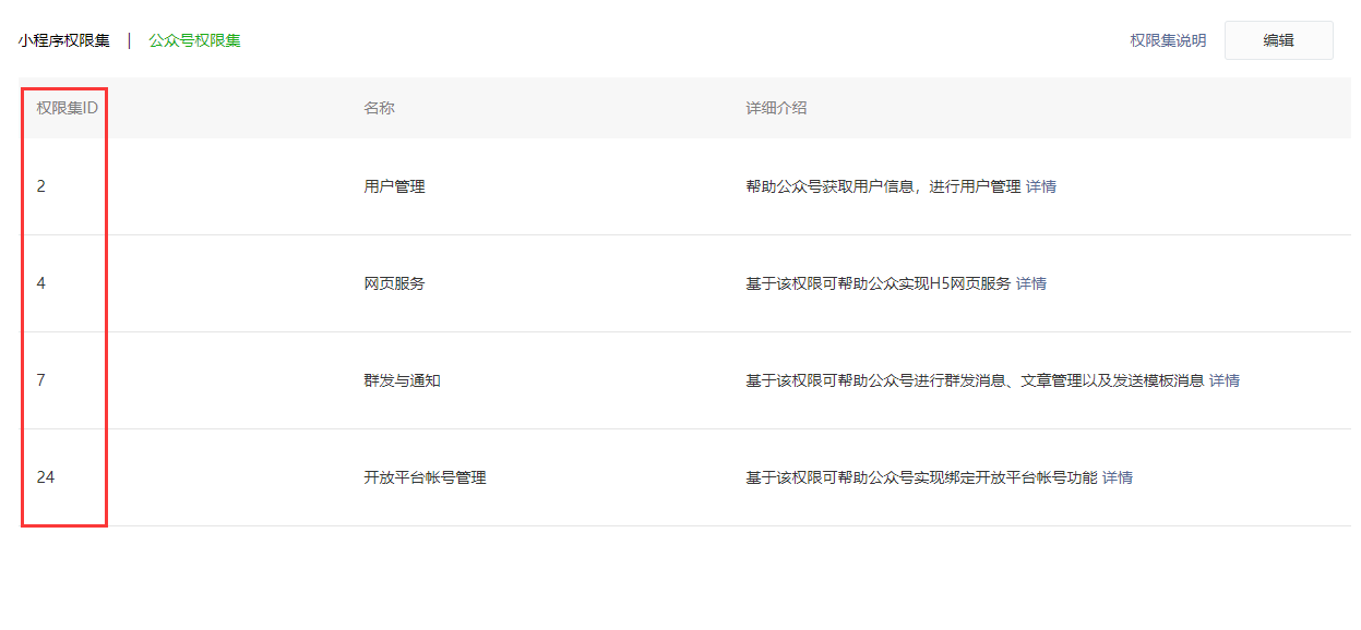 找到开发配置->权限集->公众号权限集->编辑添加权限