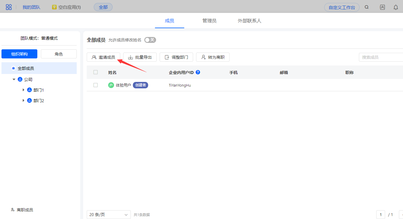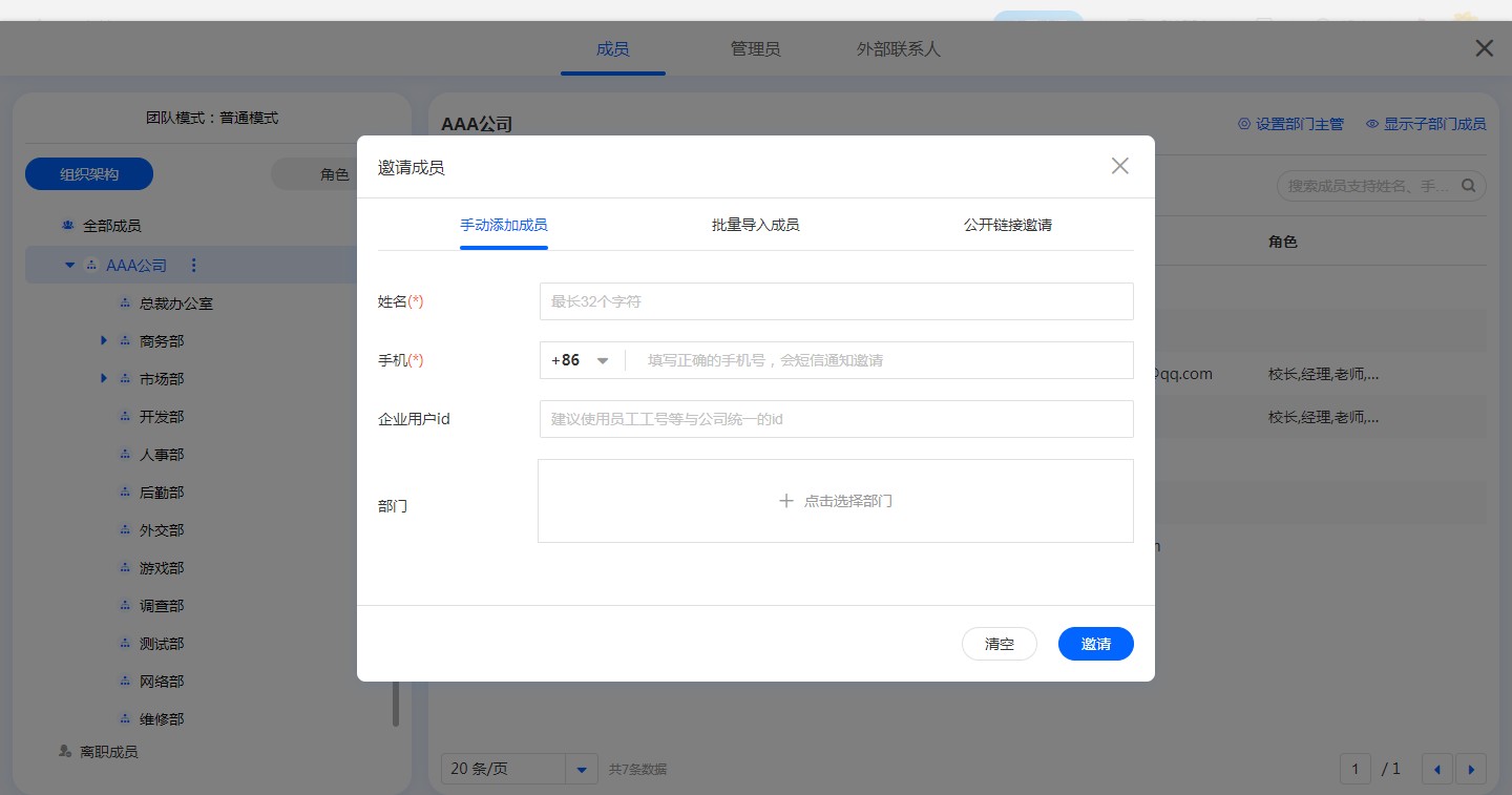 • 当【手机验证码登录注册】关闭,【邮箱验证码登录注册】开启时,管理员通讯录邀请成员时,手机选填&邮箱必填,邀请邮箱对应的账户。