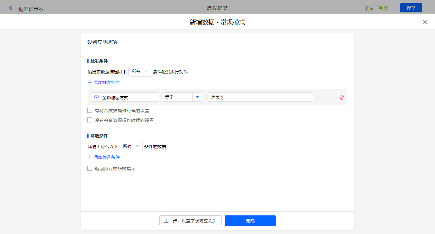 退回方式为优惠券时,退货收货之后,通过数据助手新增一优惠券到该客户下,优惠券面值为退货金额;