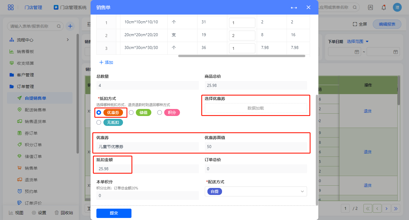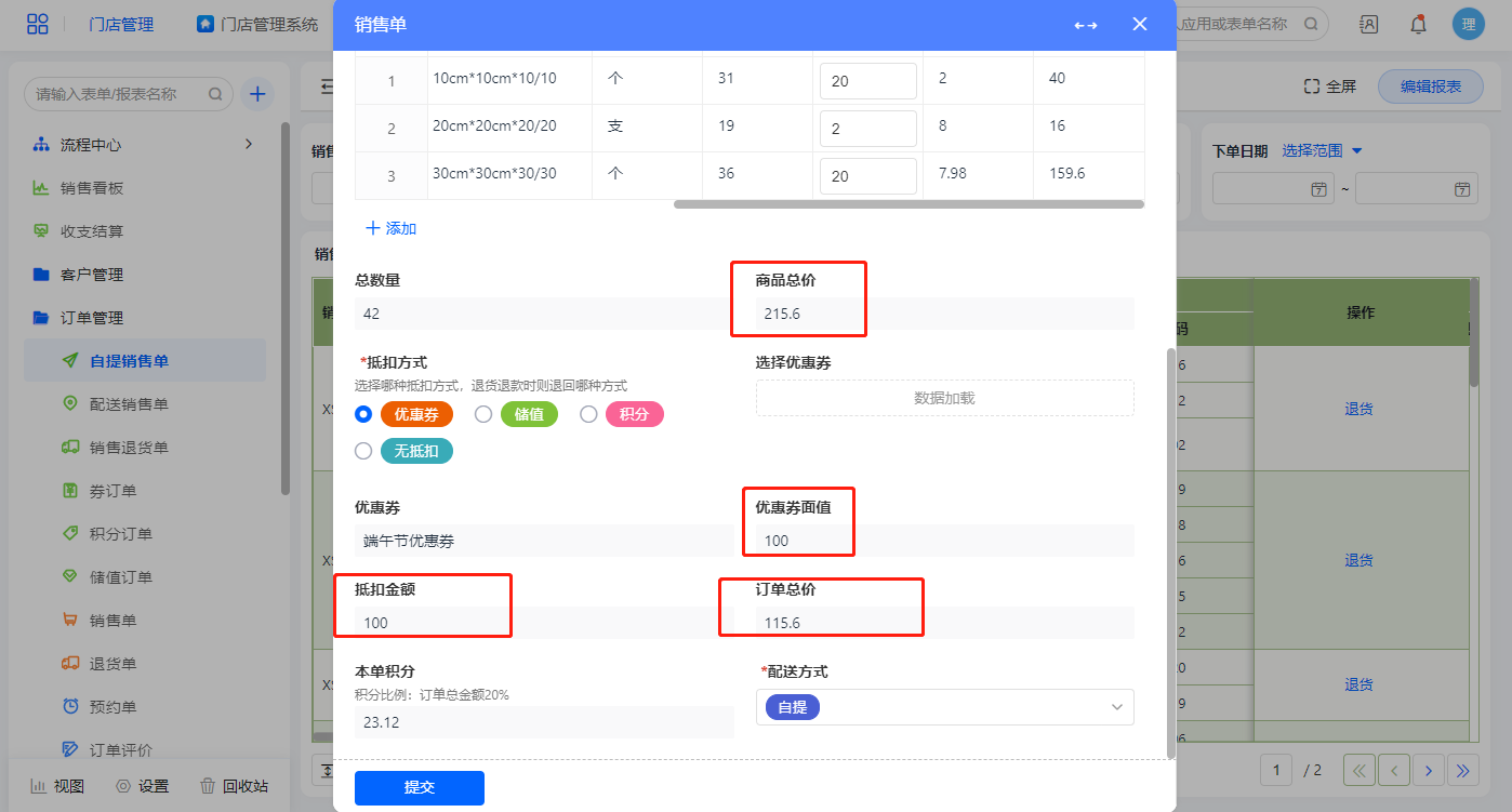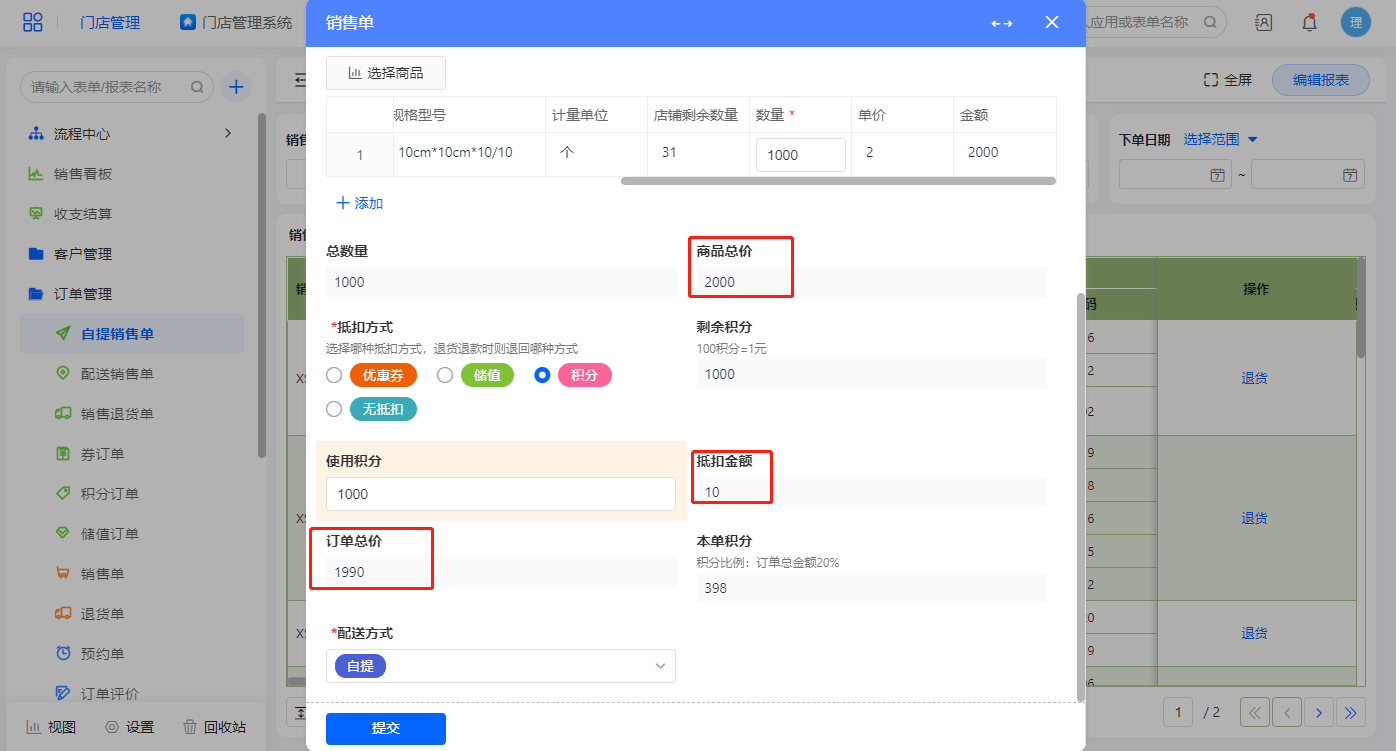 点击新增订单弹出销售单报表,配送方式默认为自提,配送方式为自提提交表单后直接结束流程;抵扣方式默认为不抵扣,订单总价则直接是商品总价,积分为订单总价的20%;