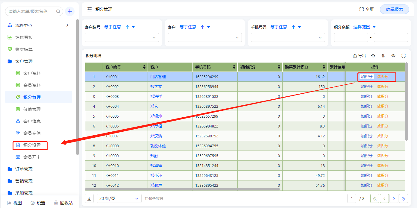 积分管理报表展示所有客户的积分信息,该报表的数据源是聚合表(客户积分结算),在此报表可操作加、减积分,该操作计入积分余额计算;