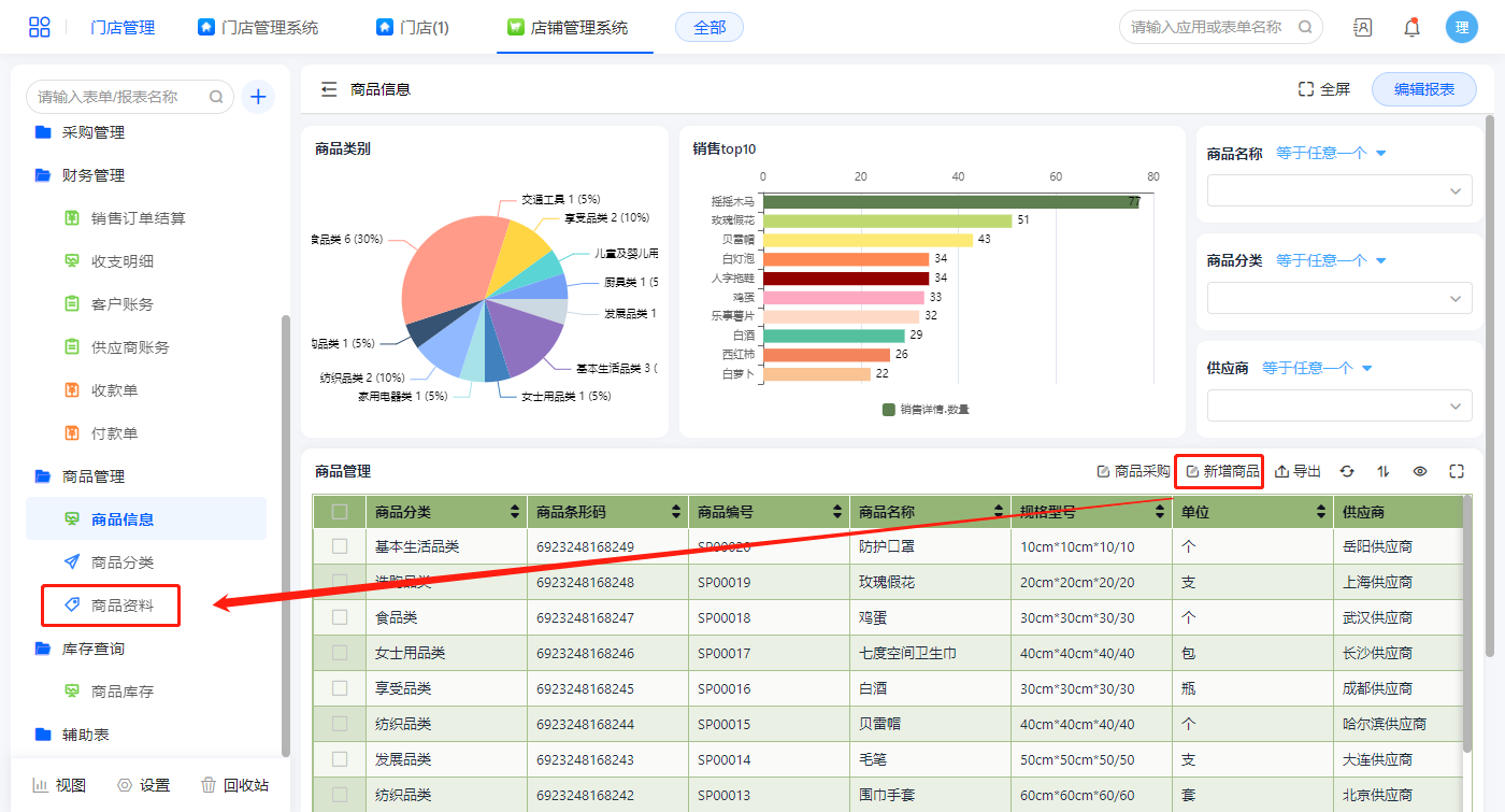 商品信息报表展示所有商品信息,在此报表可进行新增商品及商品采购操作;在新增商品信息之前先新增商品分类数据;