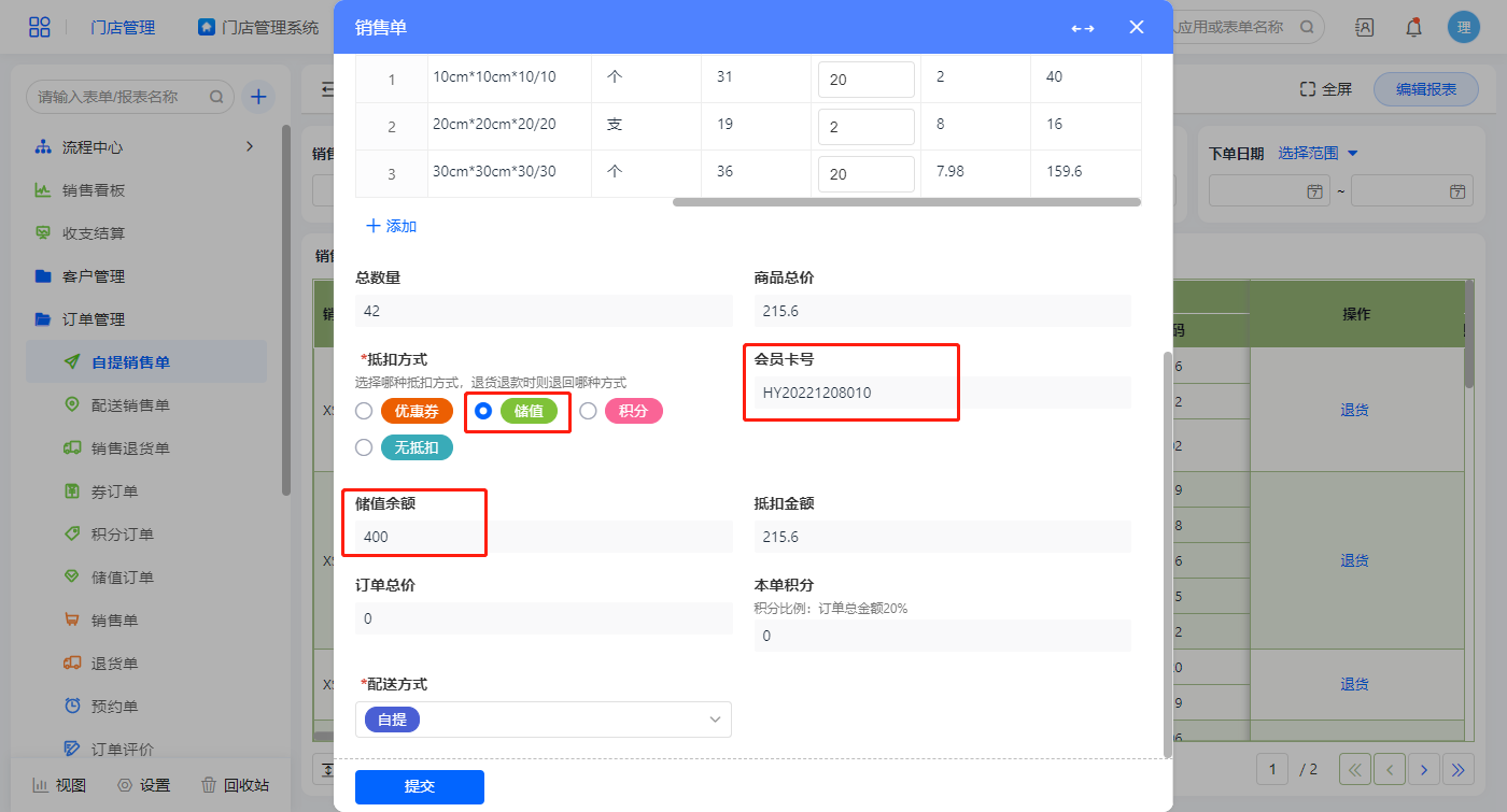 抵扣方式为储值,会员卡相关信息会通过显隐规则出现,储值可直接抵扣商品总价,订单总价为0,本单则无积分;