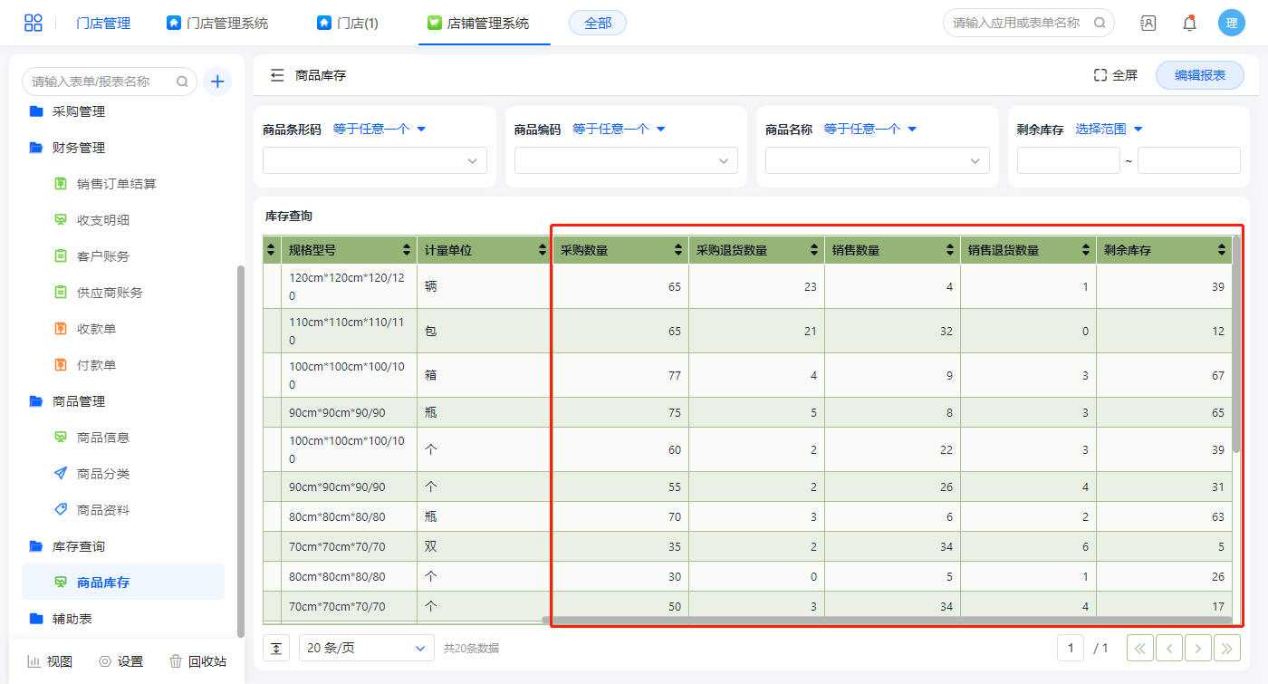 商品库存报表展示的是商品的采购、采购退货、销售、销售退货、剩余库存数量信息,该报表的数据源是聚合表(商品库存查询);