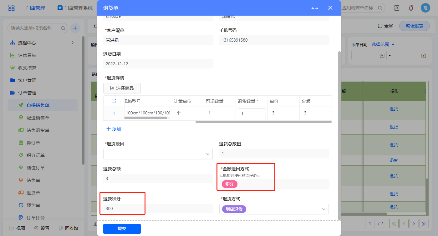 退回方式为积分,积分值为金额*100,计入积分余额计算;退回方式为储值则退回储值计入储值余额计算;